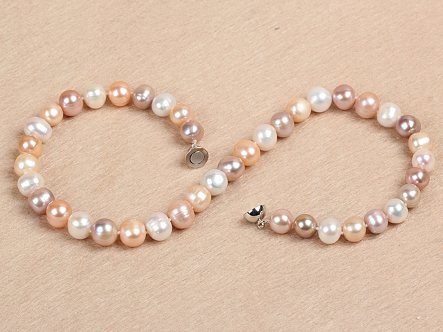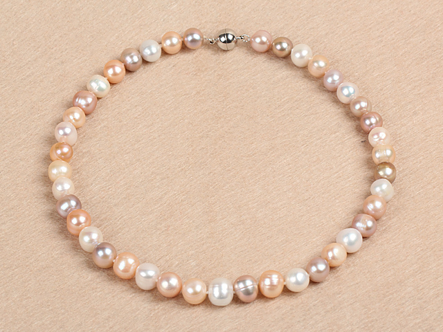 This lovely freshwater pearl necklace is strung with a mix of soft natural colours — peach, pink, cream and silvery tones. Each pearl is hand-knotted so the necklace sits nicely and feels secure.